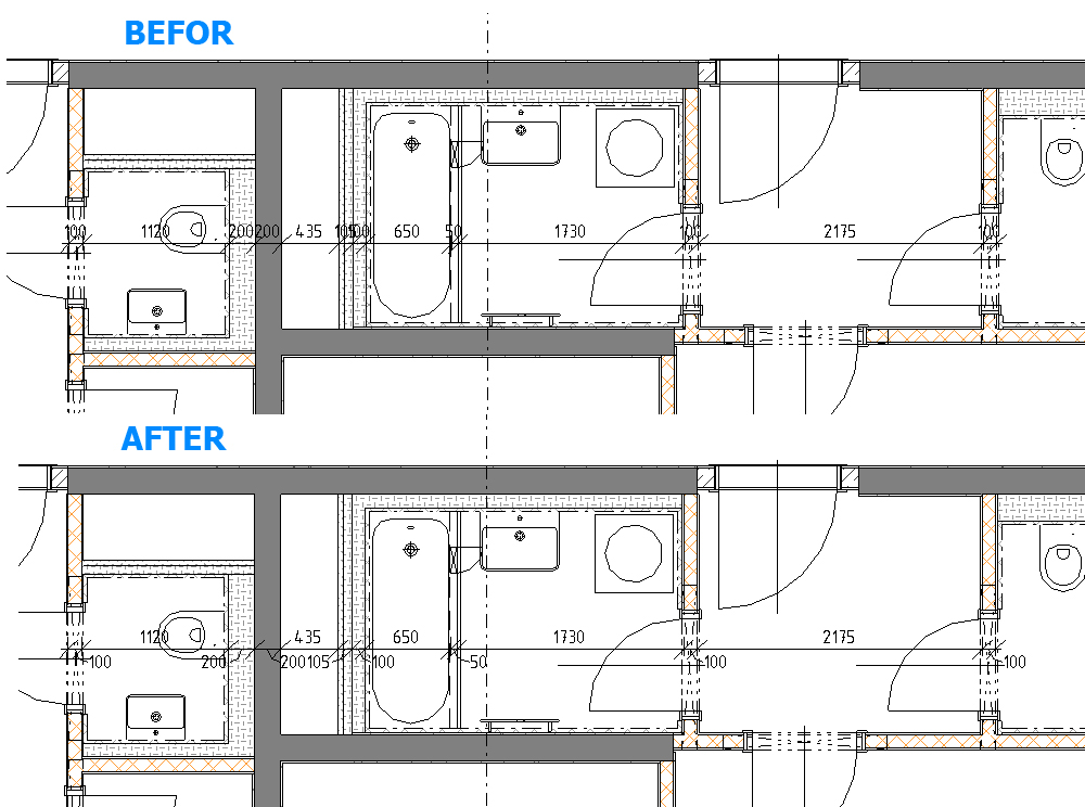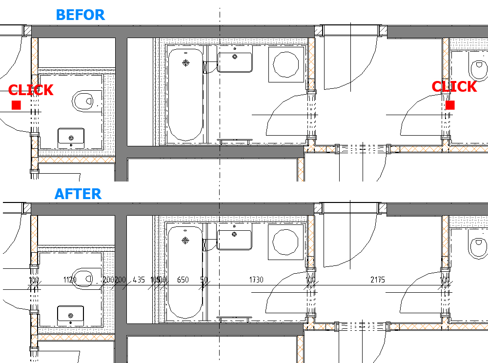 You just need to click to indicate where the dimension should be drawn, and within this range, the dimension will be generated, covering all the walls. You can choose whether to dimension the entire thickness of the wall or just the load-bearing part. You can also filter by workset, wall thickness, etc..