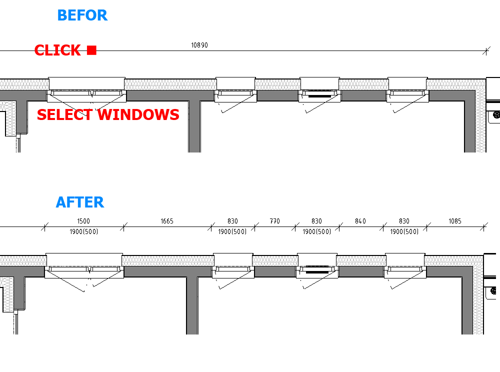 It automatically generates the bottom and top height of penetrations, both relative and absolute values. It simplifies dimensioning of windows, including sills. It handles doors as well as general models. The text on the dimension line is intelligently placed without overlap. It eliminates the "0" dimension of dimensions.